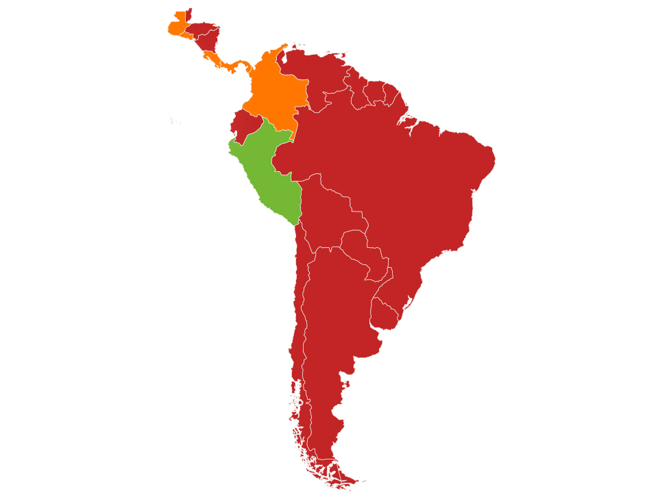 Belice, Honduras, Nicaragua, Venezuela, Guyana, Suriname, French Guiana, Ecuador, Brasil, Bolivia, Paraguay, Argentina, Chile.